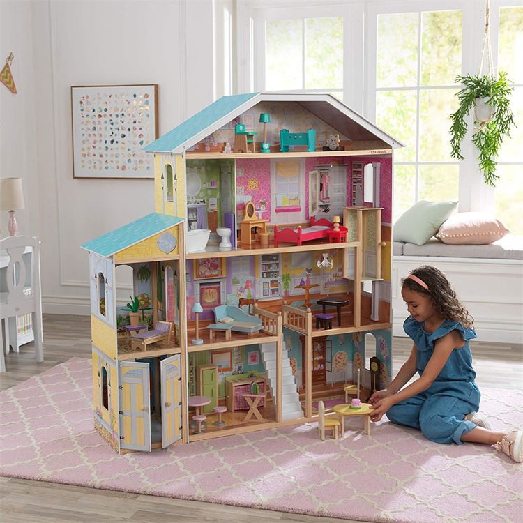 Tillbringa timmar med att leka med Majestic Mansion Dolls House. Denna 136 cm höga herrgård har 4 våningar, 8 rum, en storslagen trappa och en glidhiss för att transportera ditt barns dockor. Detta rymliga dockhus inkluderar ett 34-tillbehörspaket för möbler där barnen kommer att ha många timmars nöje att utforska Majestic Mansion med sina 12-tum (30-cm) modedockor.